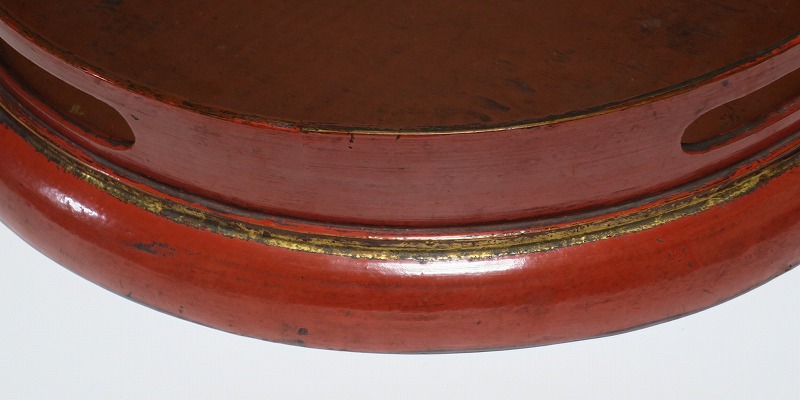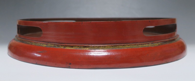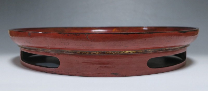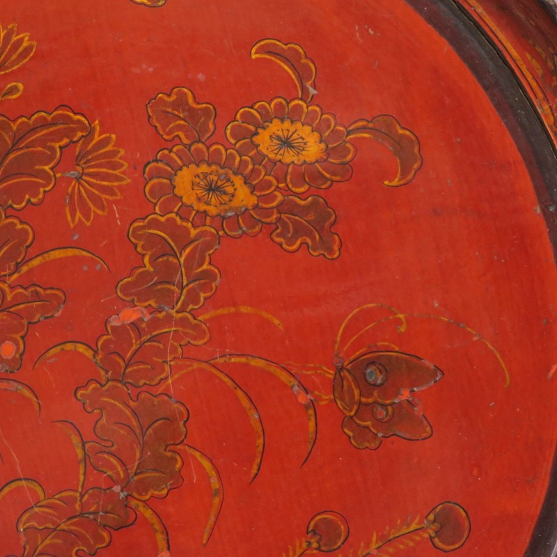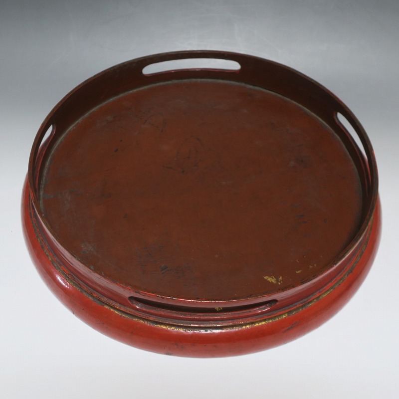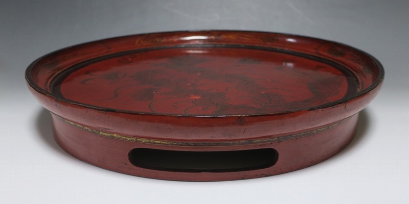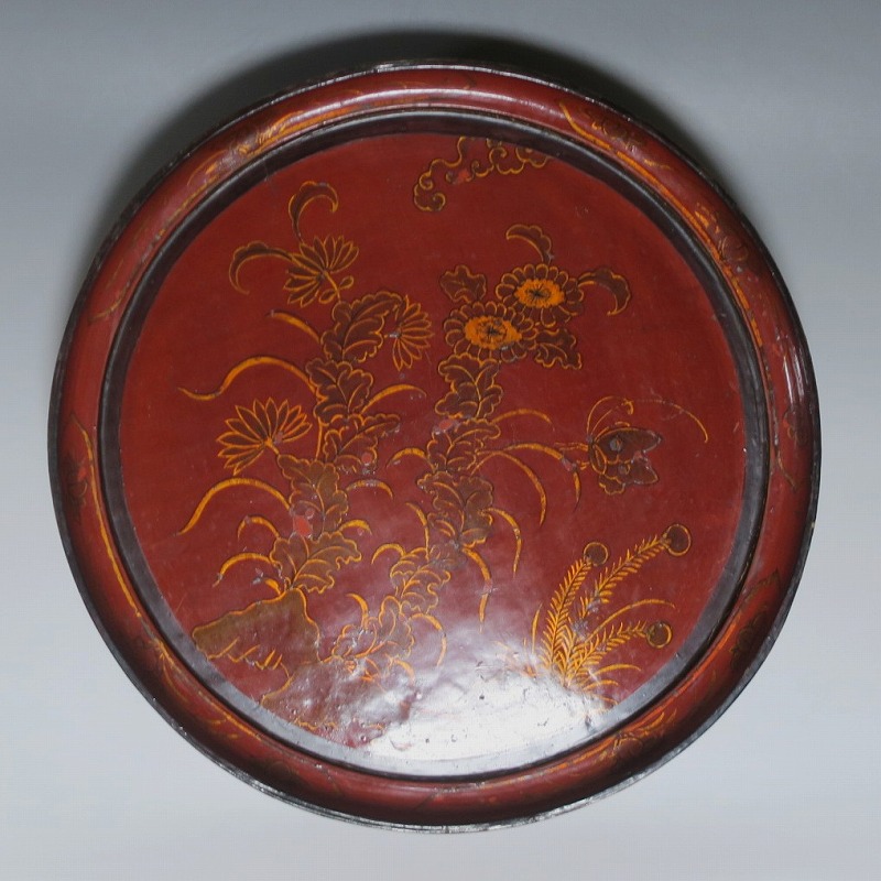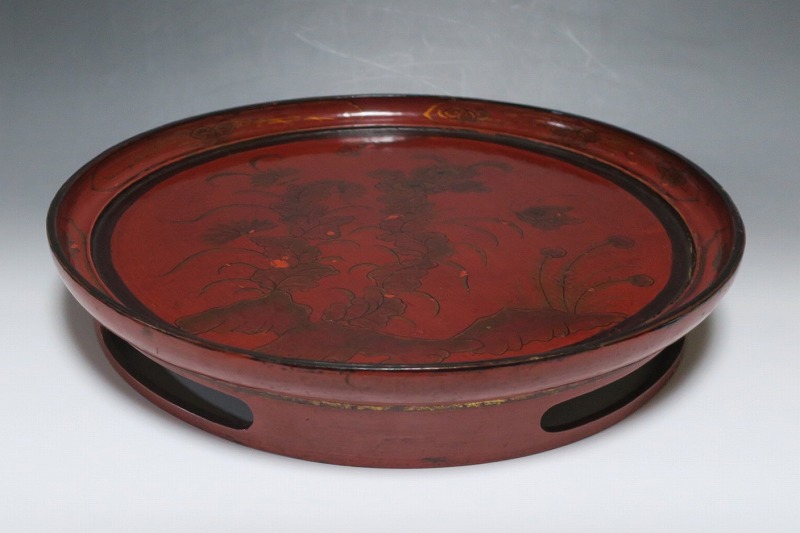 口径 約38.5cm/高さ 約6.8cm 経年による傷みや直しがあります。状態は写真でご確認ください。 漆器は古代からアジア全体に広まっている工芸です。日本では9000年前、中国では7400年前の漆器が遺跡から出土しており、古代人が漆工芸を重んじていたことがわかります。本品は18世紀、清で製作された朱漆の花文高台付き盆。かわいらしい花と蝶が描かれた華やかな感じの作品です。世界各地の民芸館に展示されるクラスの味わい深い漆器。飾り台や食器をのせる盆としてお楽しみください。 | ||