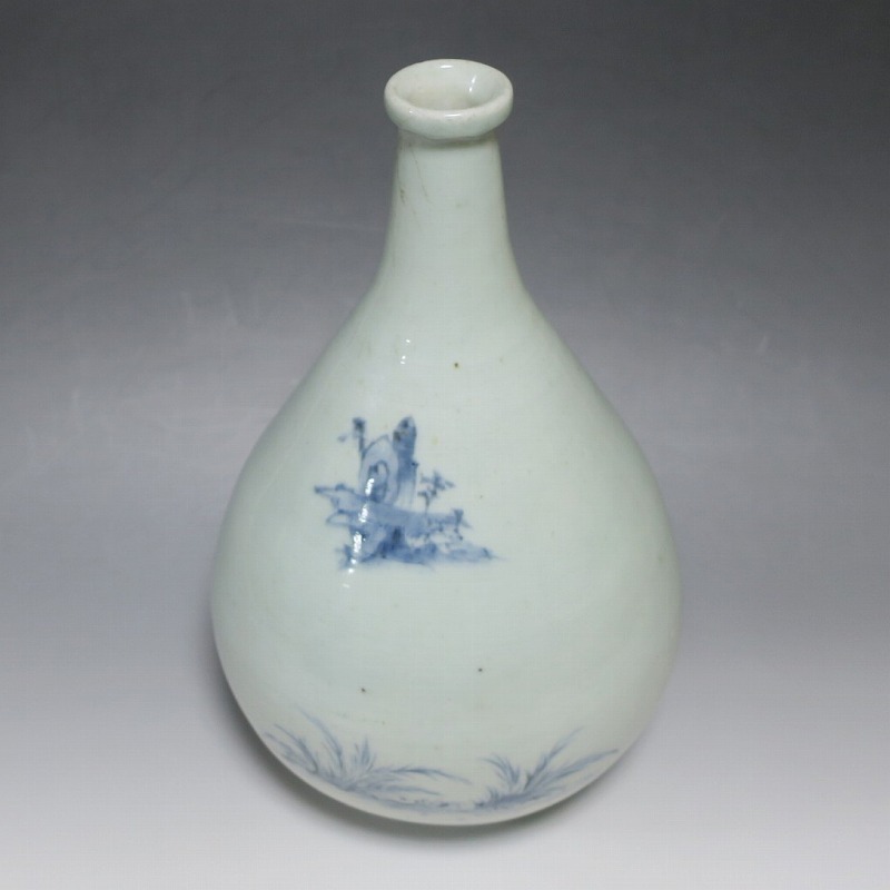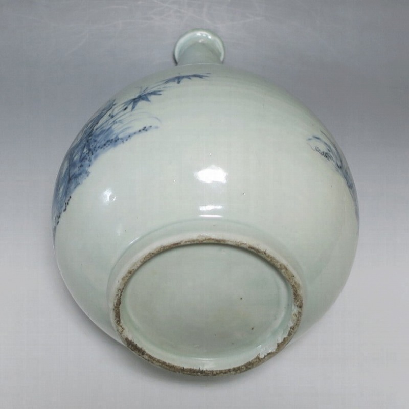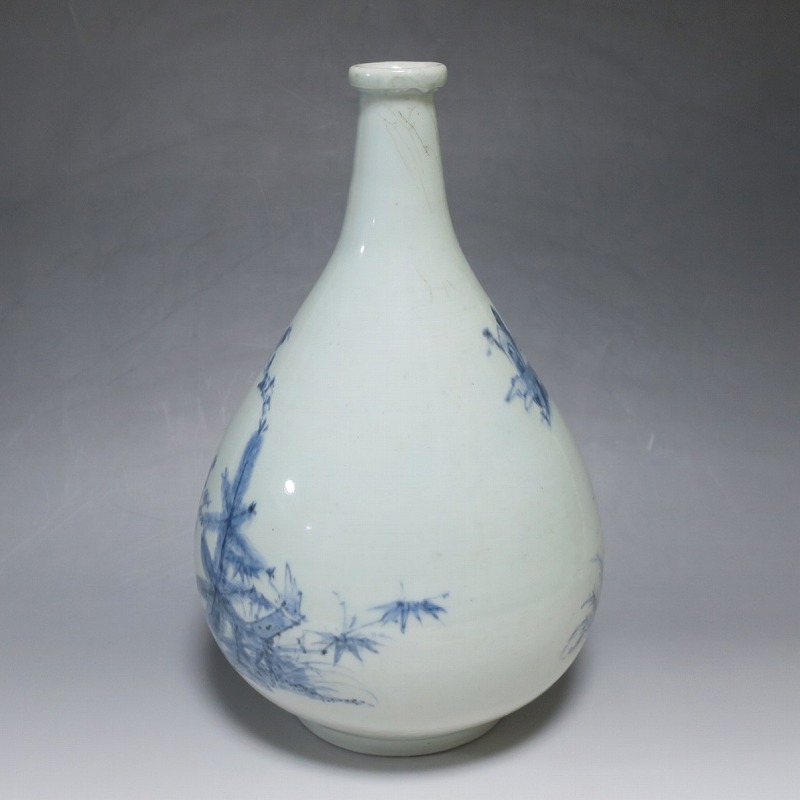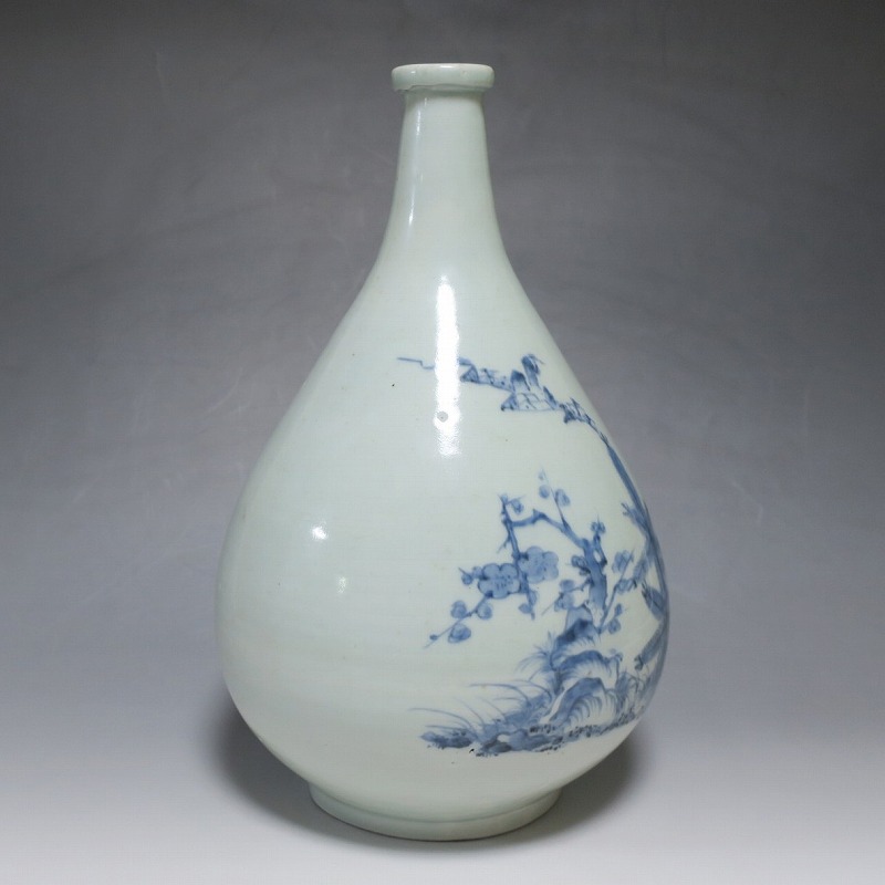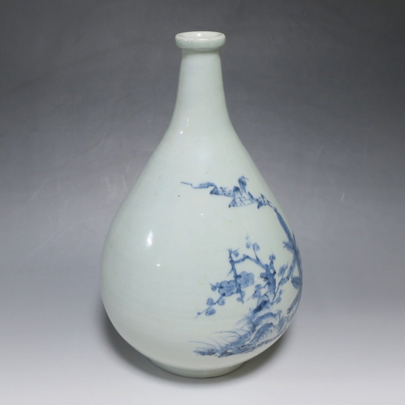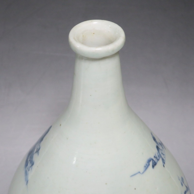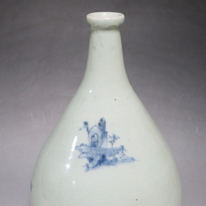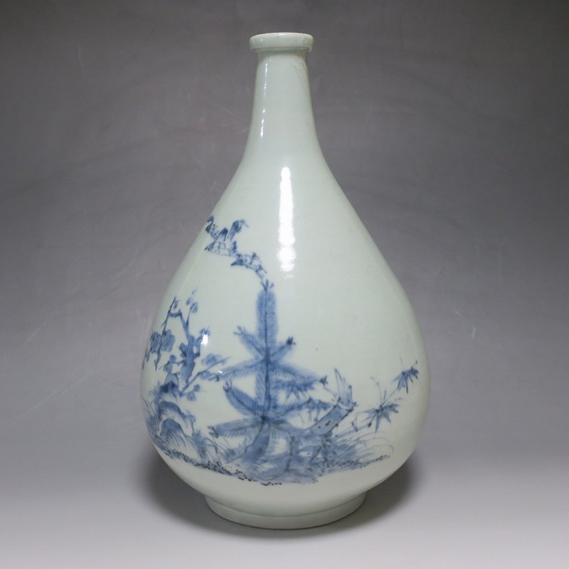 高さ 約30cm/胴径 約18.7cm 窯傷や経年の汚れ、首の一部にカンニュウがありますが、割れや欠けはありません。状態は写真でご確認ください。 高屋焼は兵庫県豊岡市で天保元年(1830年)に開かれた伊万里系磁器の窯です。開窯から廃窯までわずか十年しか活動していませんが、雑器の他、京都人の要望に対応したハイセンスな大作を生産しています。本品は胴部に松竹梅と山水を描いたらっきょう徳利。絵師が描いた作品なので上品な雰囲気の作品に仕上がっています。資料館級の作品で美しい形をしています。インテリアや花器としてお楽しみください。 | ||
