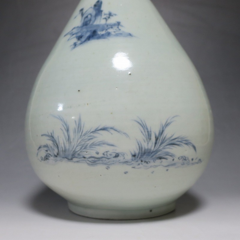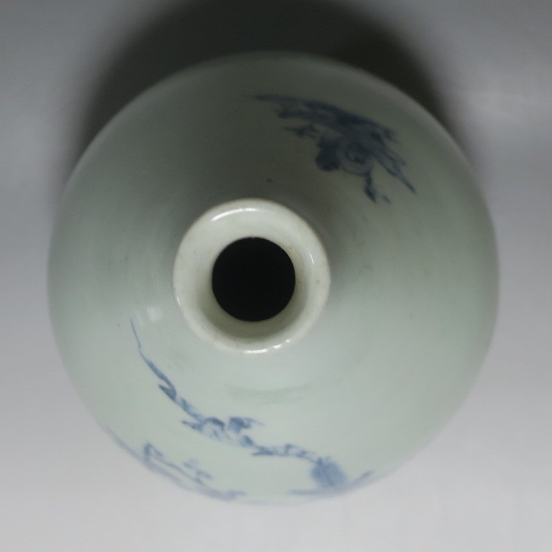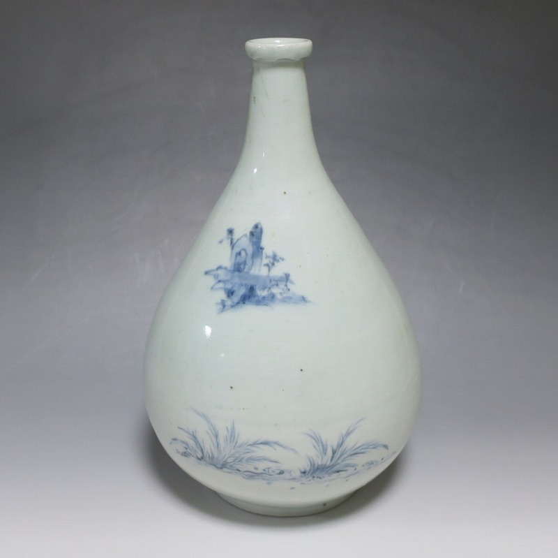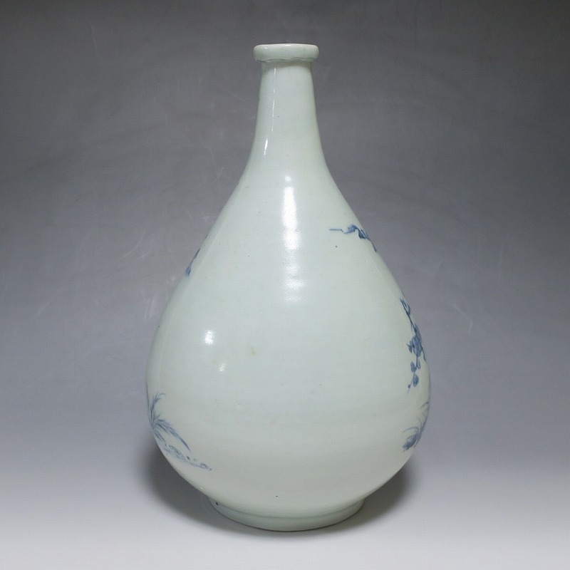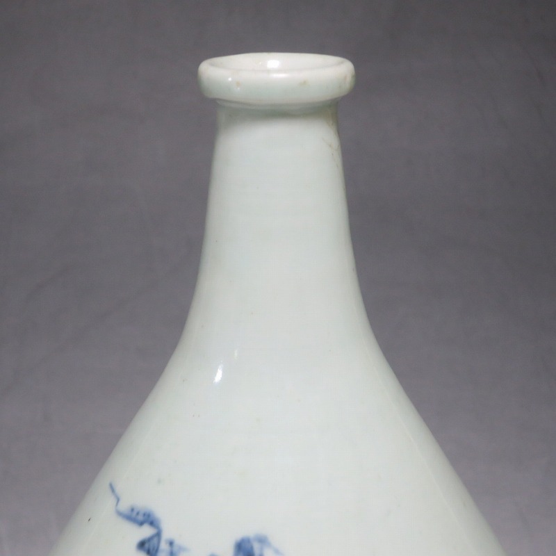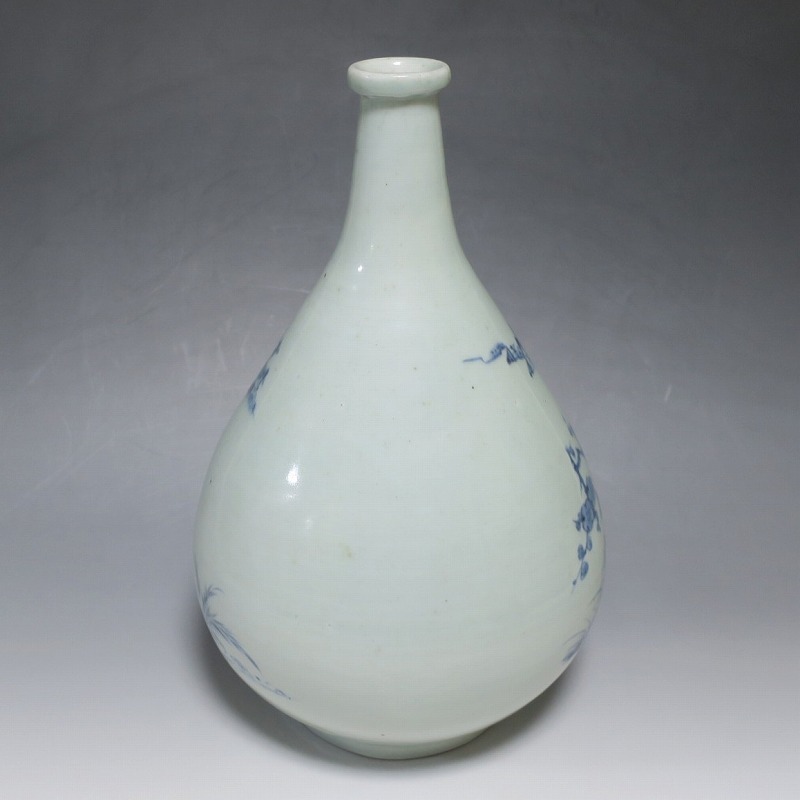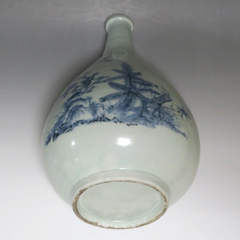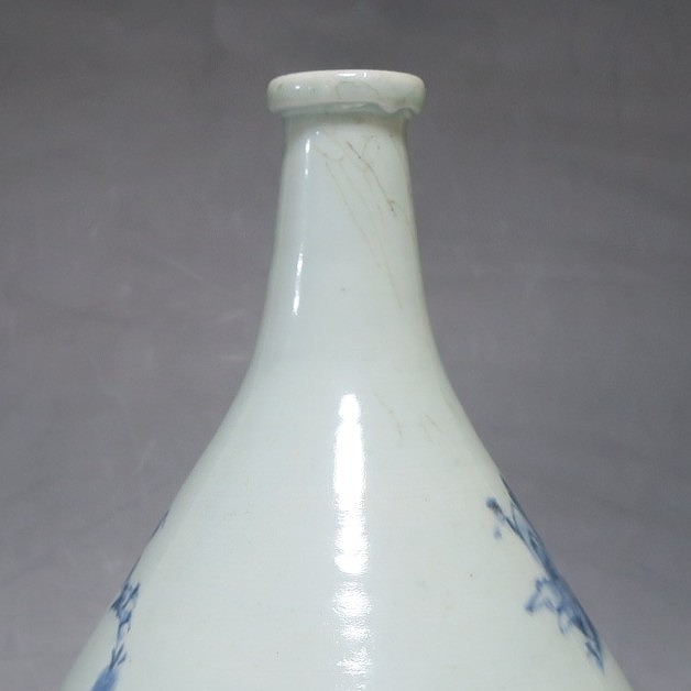 高さ 約30cm/胴径 約18.7cm 窯傷や経年の汚れ、首の一部にカンニュウがありますが、割れや欠けはありません。状態は写真でご確認ください。 高屋焼は兵庫県豊岡市で天保元年(1830年)に開かれた伊万里系磁器の窯です。開窯から廃窯までわずか十年しか活動していませんが、雑器の他、京都人の要望に対応したハイセンスな大作を生産しています。本品は胴部に松竹梅と山水を描いたらっきょう徳利。絵師が描いた作品なので上品な雰囲気の作品に仕上がっています。資料館級の作品で美しい形をしています。インテリアや花器としてお楽しみください。 | ||