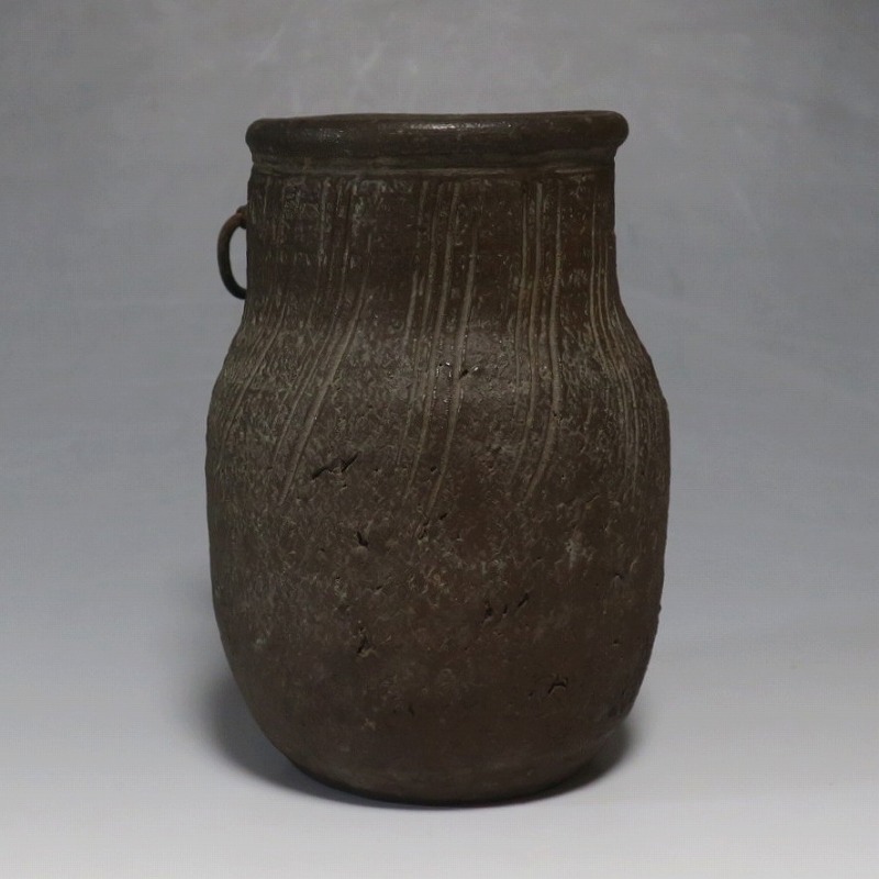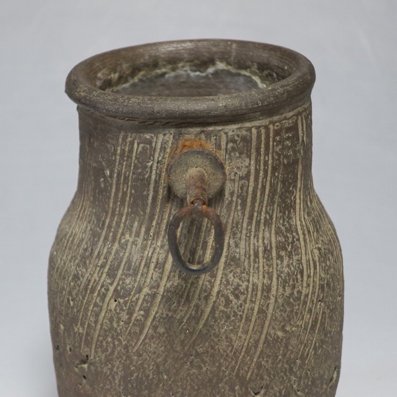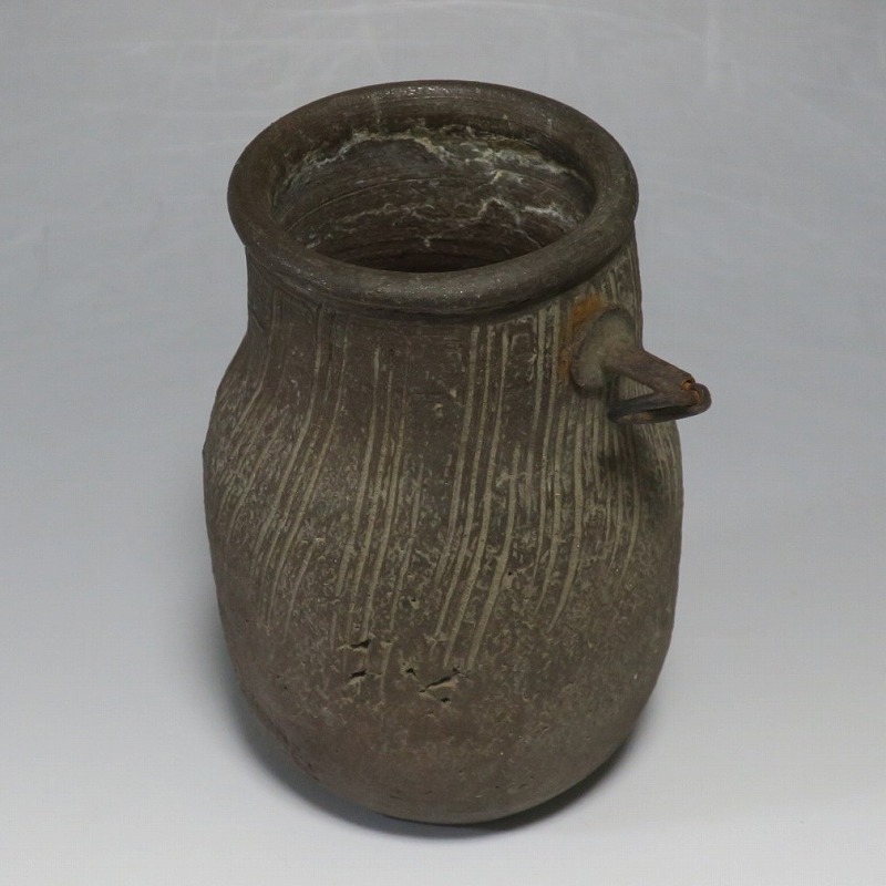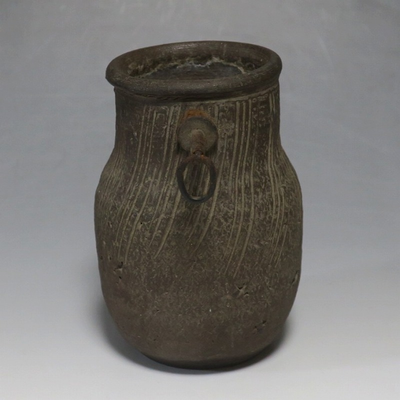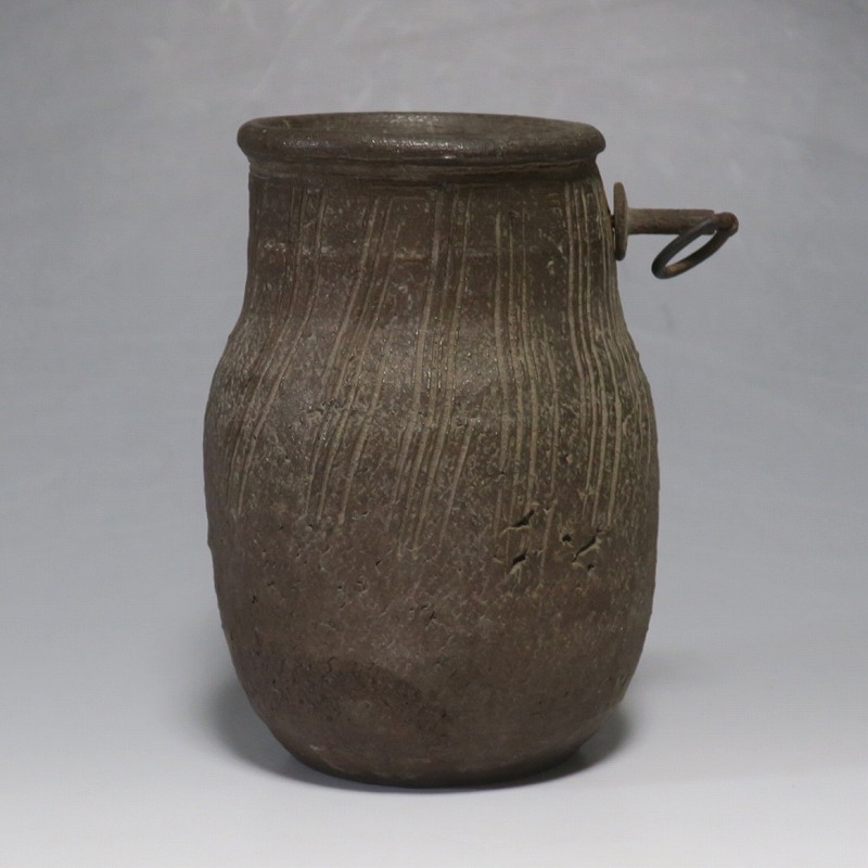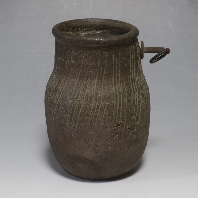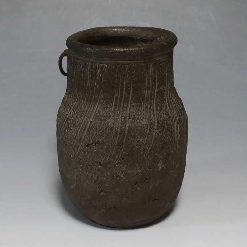 (江戸時代後期 19世紀前半) 商品番号 4267 高さ 約13cm/胴径 約9cm/口径 約7.2cm 窯傷や水垢、金具に経年の錆がありますが、総じて良い状態です。状態は写真でご確認ください。 壺屋は1682年の開窯以来、沖縄陶器の中心として活動している窯です。昭和時代初期、民芸運動で注目されて以来、その知名度が上がりました。本品は無釉薬のアラヤチ(荒焼)で製作された掛け花入れ。調味料入れなどに使用されていた小壺を掛け花に仕立てた作品です。胴部のひっかき文が個性となっている珍しい形の掛け花入れ。侘びた感じの作品です。花器としてお楽しみください。 | ||