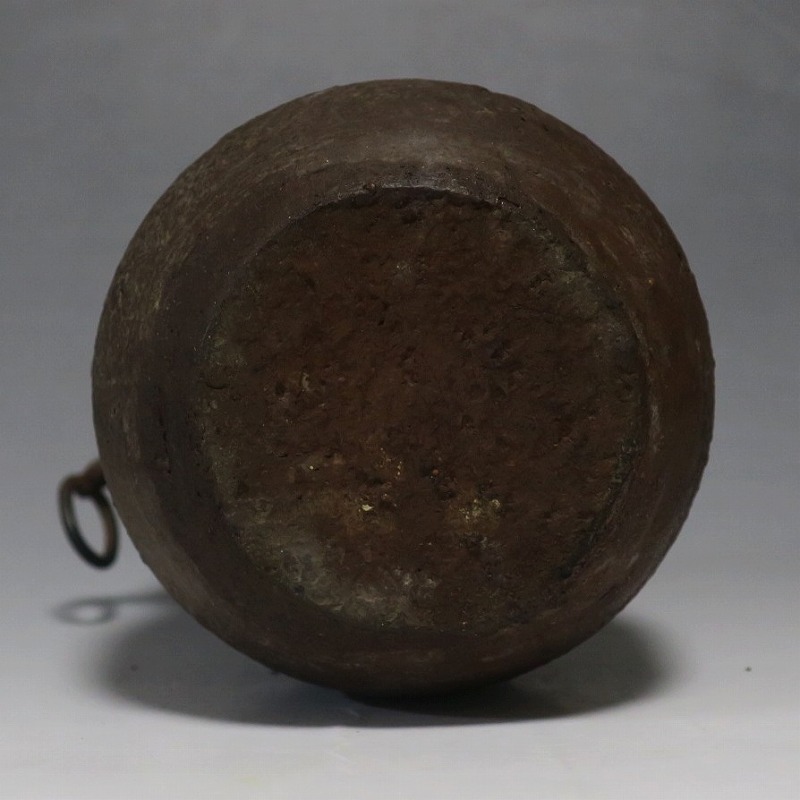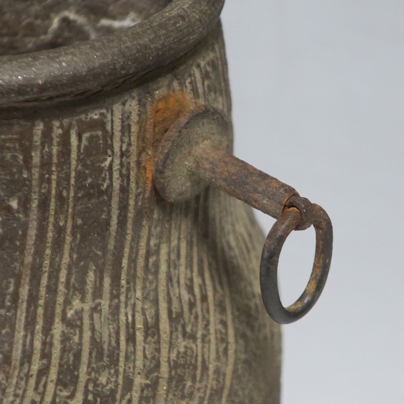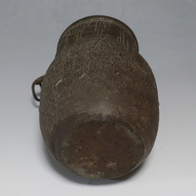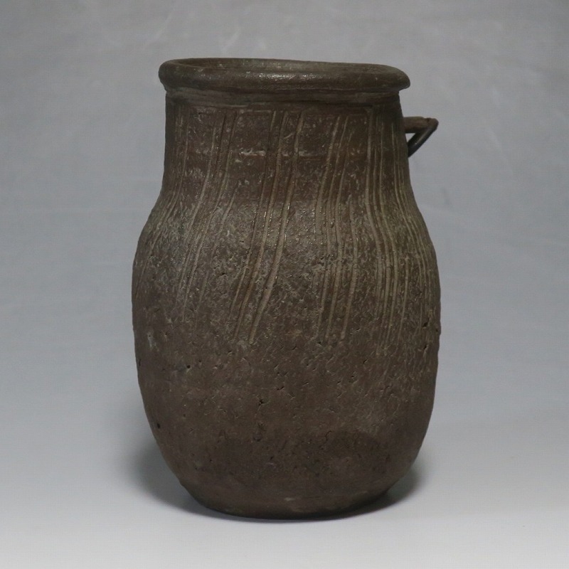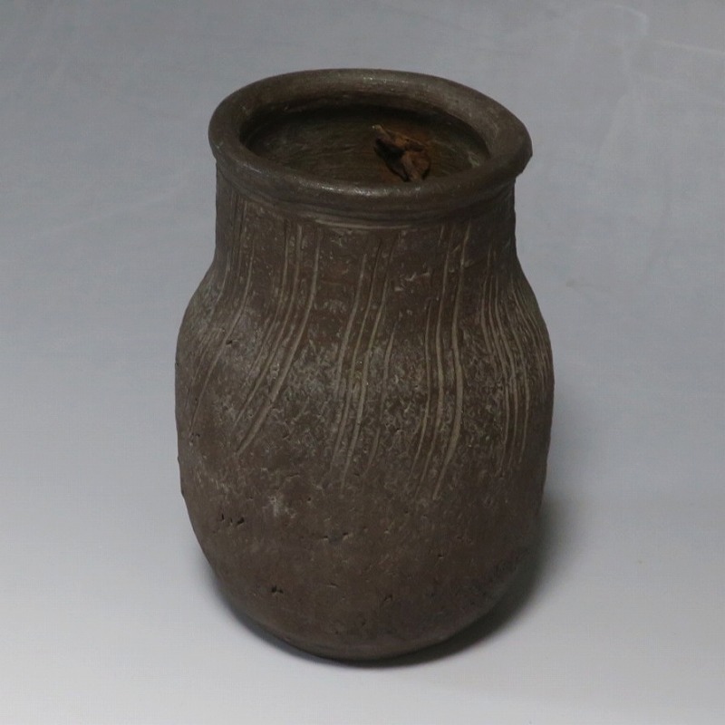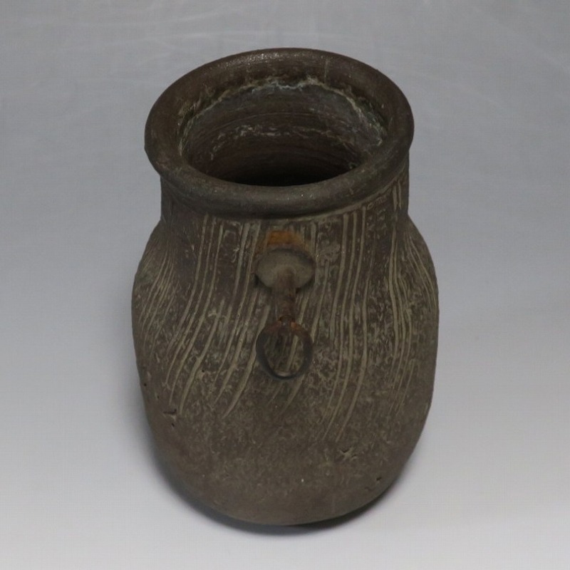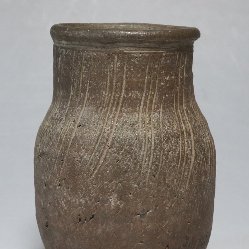 (江戸時代後期 19世紀前半) 商品番号 4267 高さ 約13cm/胴径 約9cm/口径 約7.2cm 窯傷や水垢、金具に経年の錆がありますが、総じて良い状態です。状態は写真でご確認ください。 壺屋は1682年の開窯以来、沖縄陶器の中心として活動している窯です。昭和時代初期、民芸運動で注目されて以来、その知名度が上がりました。本品は無釉薬のアラヤチ(荒焼)で製作された掛け花入れ。調味料入れなどに使用されていた小壺を掛け花に仕立てた作品です。胴部のひっかき文が個性となっている珍しい形の掛け花入れ。侘びた感じの作品です。花器としてお楽しみください。 | ||