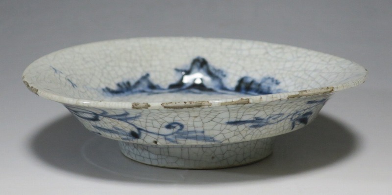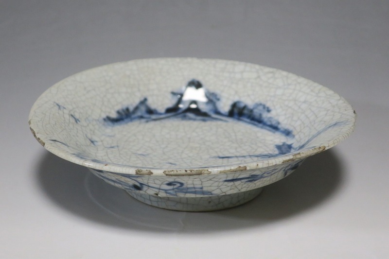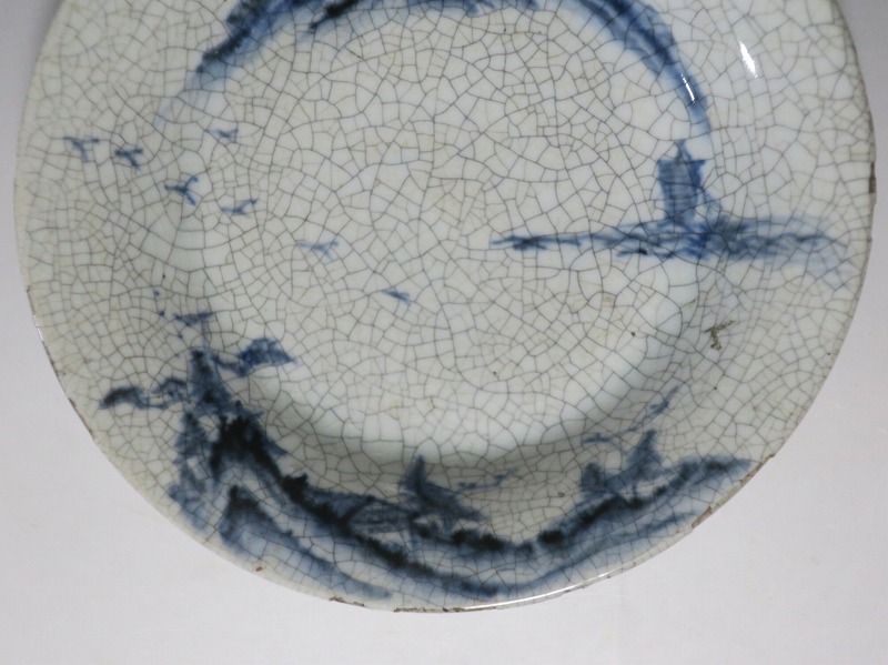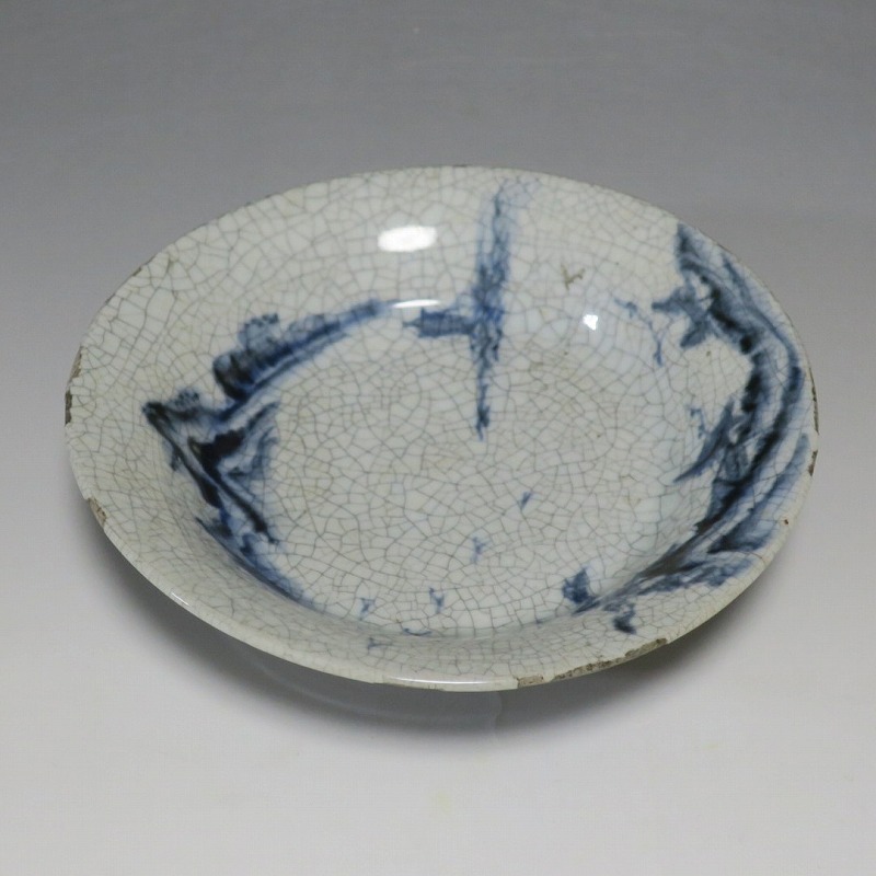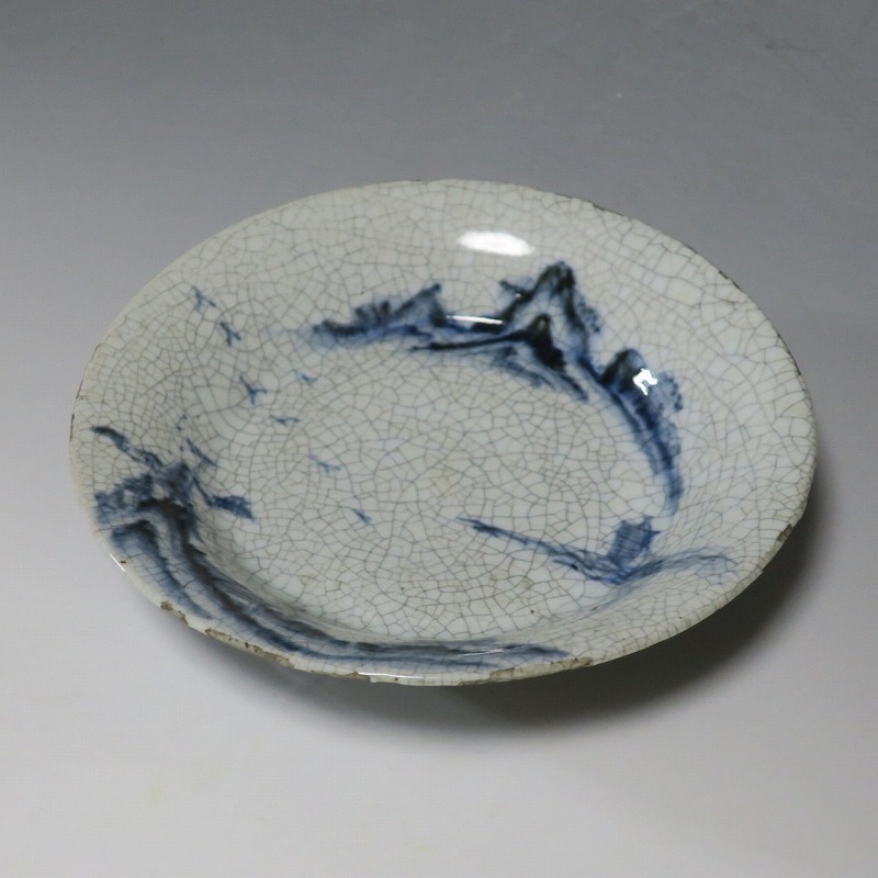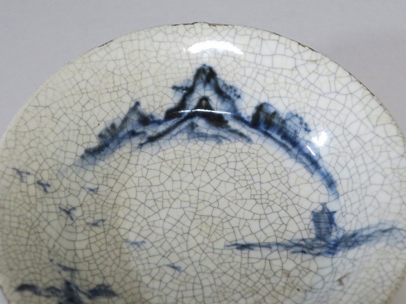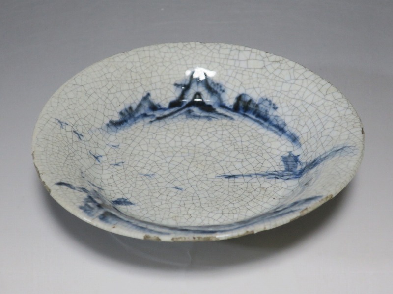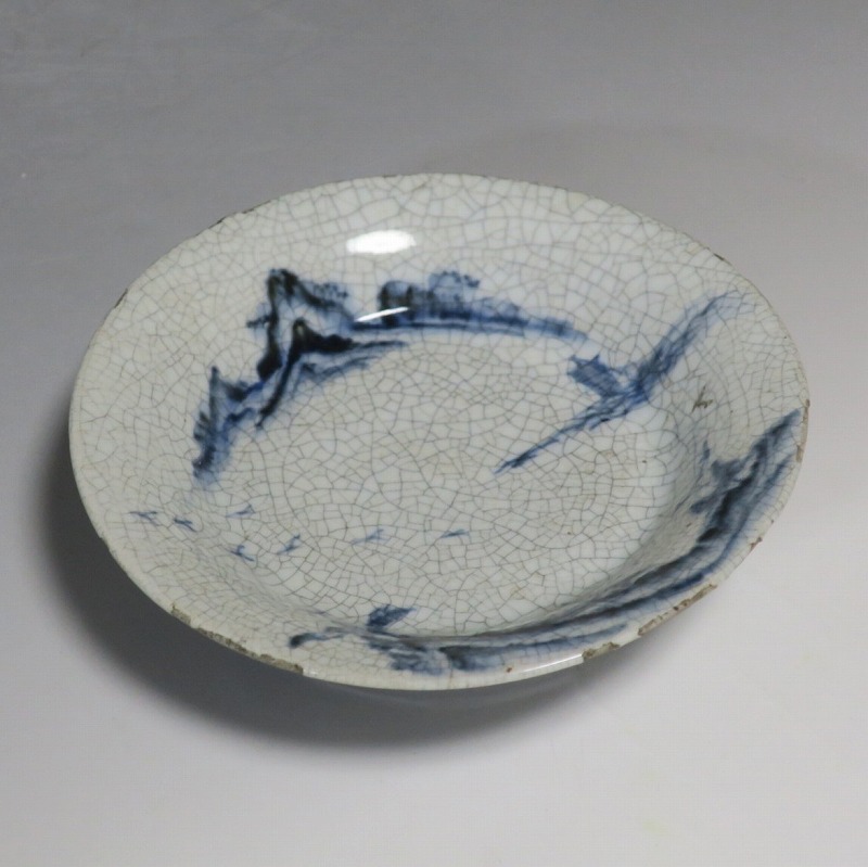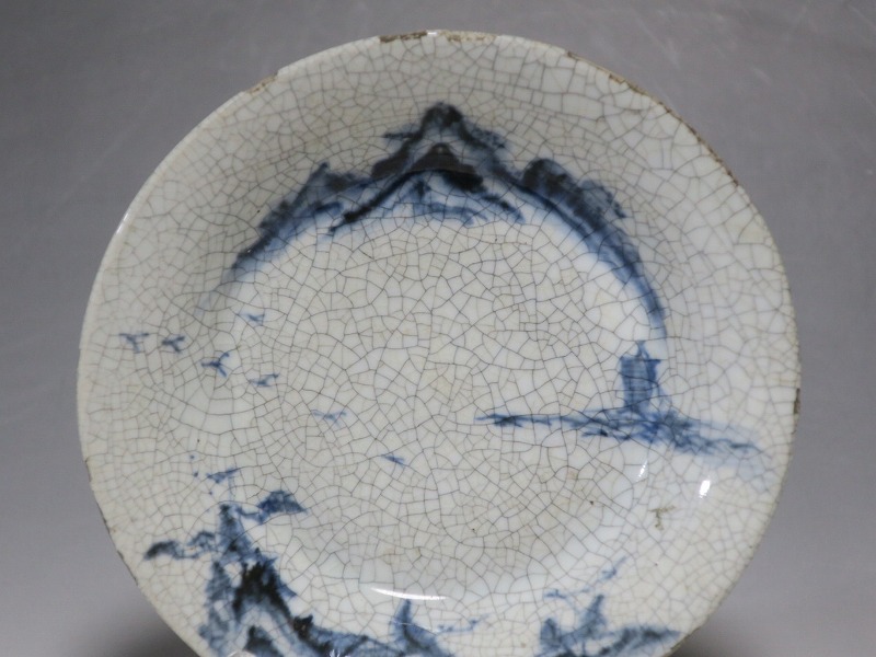 (江戸時代中期 18世紀後半) 商品番号 4270 口径 約14.9cm/高さ 約3.8cm/高台径 約6.7cm 口辺に釉ハゲ、高台に約9mmのアタリがあります。状態は写真でご確認ください。 中野焼は、現在の平戸市山中町紙漉に17世紀初頭に開かれた窯です。初期は熊川風に茶碗を製作していましたが、江戸時代中期になると鉄分の強い土に灰釉薬を掛けたひび焼の染付作品を作るようになりました。本品は18世紀後半に製作された染付で山水を描いた五寸皿。半陶半磁で唐津焼に染付を施したような感じの作品です。和食や日本酒のあてを盛る食器として使用すると楽しいでしょう。 | ||