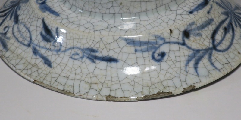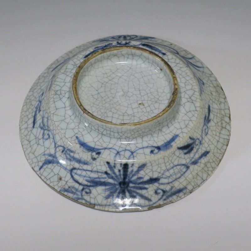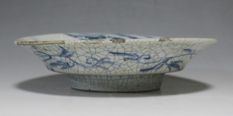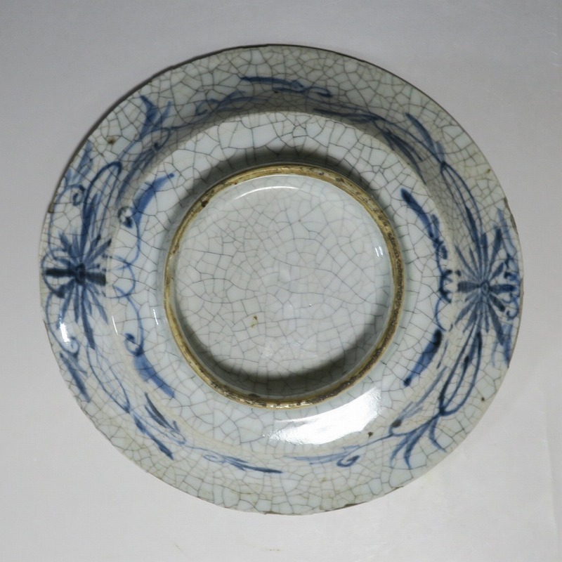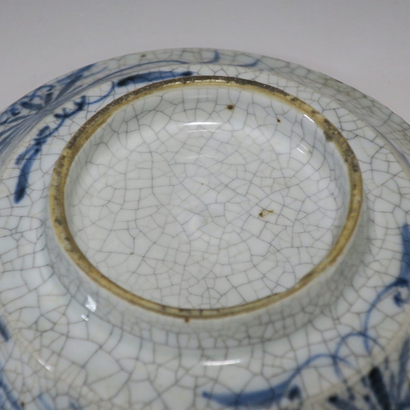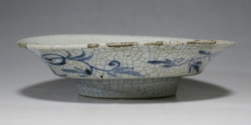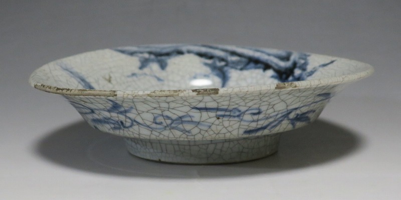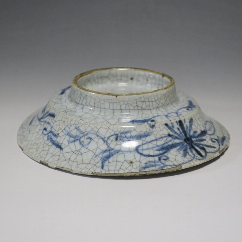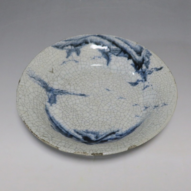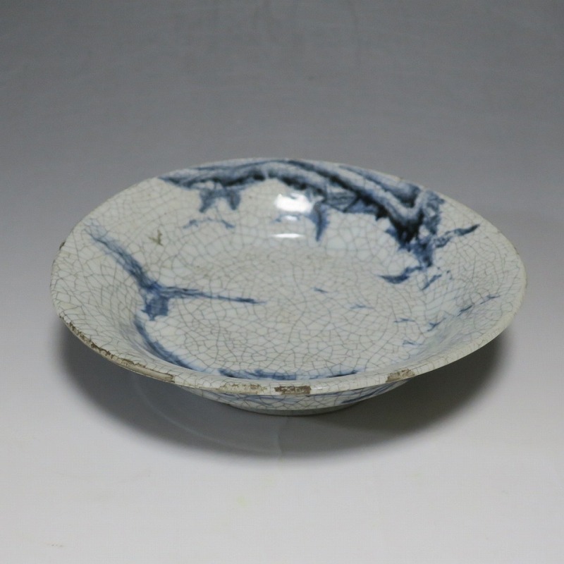 (江戸時代中期 18世紀後半) 商品番号 4270 口径 約14.9cm/高さ 約3.8cm/高台径 約6.7cm 口辺に釉ハゲ、高台に約9mmのアタリがあります。状態は写真でご確認ください。 中野焼は、現在の平戸市山中町紙漉に17世紀初頭に開かれた窯です。初期は熊川風に茶碗を製作していましたが、江戸時代中期になると鉄分の強い土に灰釉薬を掛けたひび焼の染付作品を作るようになりました。本品は18世紀後半に製作された染付で山水を描いた五寸皿。半陶半磁で唐津焼に染付を施したような感じの作品です。和食や日本酒のあてを盛る食器として使用すると楽しいでしょう。 | ||
